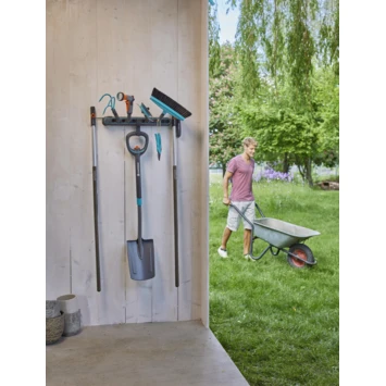 Met het GARDENA combisystem Gereedschapsrek Flex heb je ruimtebesparende opslag voor je GARDENA combisystem-accessoires en -stelen. Het Gereedschapsrek Flex heeft vier gereedschapshouders, inclusief een klein haakje voor het opbergen van kleine gereedschappen, snoeischaren en scharen, maar ook een universele haak. De gereedschapshouders zijn flexibel en vrij plugbaar, en je kan ze in stappen van 30° draaien om ze naar wens te positioneren. De houders zijn geschikt voor het opbergen van je GARDENA combisystem- en Original GARDENA System-accessoires. De universele haak laat je tuingereedschappen zoals schoppen opbergen. Je kan het gereedschapsrek verticaal of horizontaal uitlijnen, om de ruimte op je muur optimaal te benutten. Daarnaast biedt het gereedschapsrek ruimte voor tot wel 4 combisystem-stelen, dankzij de metalen hangers. Als je meer gereedschappen wil opslaan kan je het rek uitbreiden met het Gereedschapsrek Flex (art. nr. 3507-20). Je kan stelen die geen onderdeel vormen van het combisystem opbergen met de Steelhouder Flex (art. nr. 3508-20), met een horizontale uitlijning. Als je binnen 3 maanden na aankoop registreert bij gardena.com/registration, ondersteunt GARDENA het combisystem Gereedschapsrek Flex met een garantie van 25 jaar. Let your tool family grow. GARDENA combisystem. Verwisselbaar. Duurzaam. Voor al je tuinwerk.