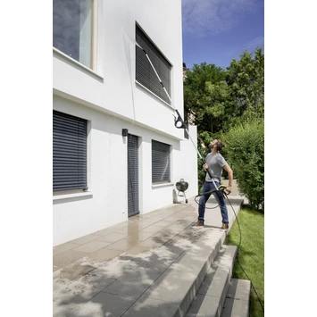 Met de telescopische spuitlans kunnen zelfs moeilijk toegankelijke plaatsen zoals gevels snel en moeiteloos worden gereinigd. Het 180 graden verstelbare scharnier is een ander voordeel en maakt het schoonmaken van serres, schuine daken en carports mogelijk. De bediening is heel eenvoudig dankzij het comfortabele telescoopmechanisme met één druk op de knop. De telescopische spuitlans kan worden uitgeschoven tussen 1,20 en 3,70 meter, waardoor het reinigen van gebieden tot 5 meter hoogte mogelijk is. De bevestiging van alle spuitpistolen is heel eenvoudig. De druk kan gemakkelijk worden geregeld bij gebruik met het Full Control Plus- of Smart Control-spuitpistool.